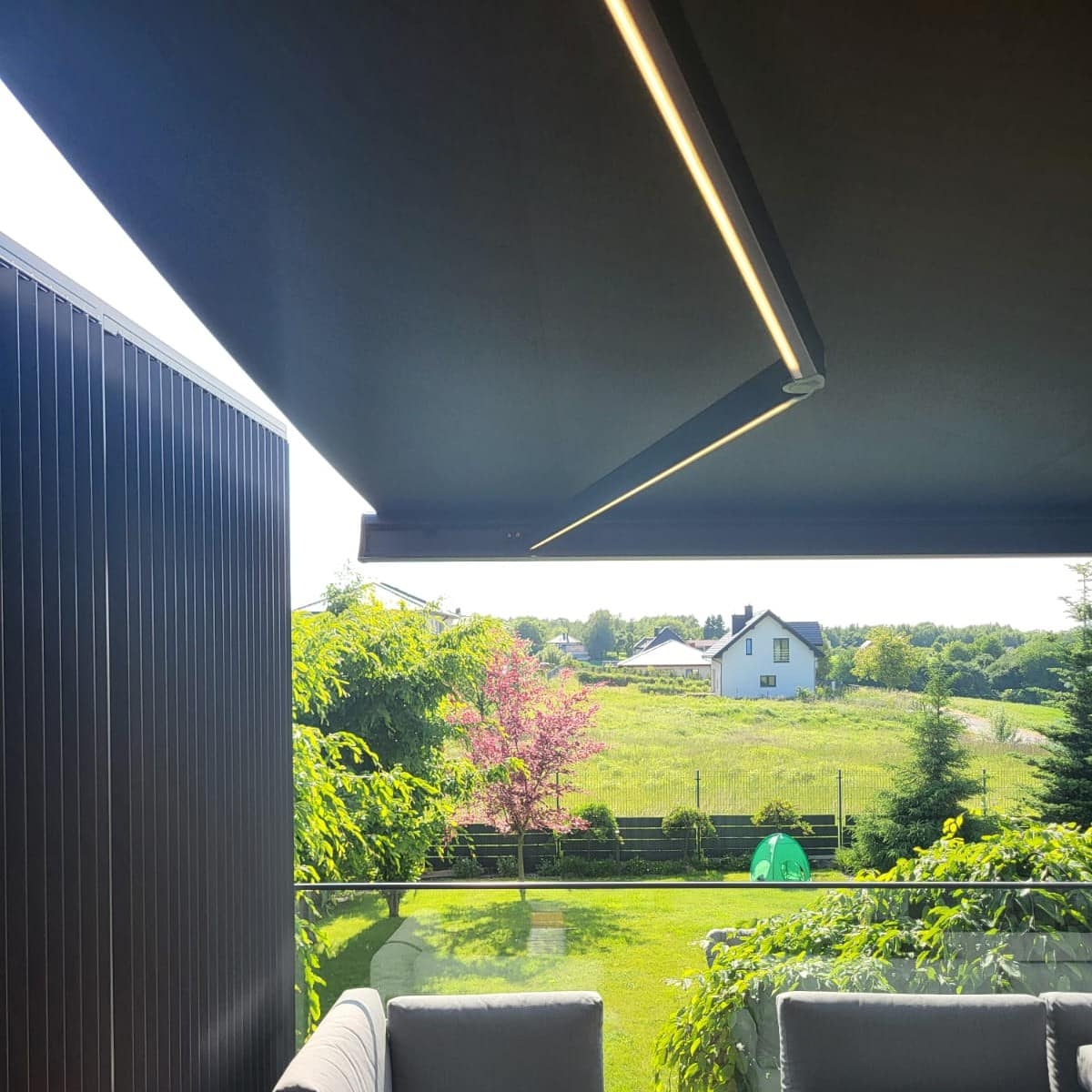 Markiza tarasowa Scala z opcjonalnym oświetleniem LED w belce przedniej, tylnej oraz ramionach.